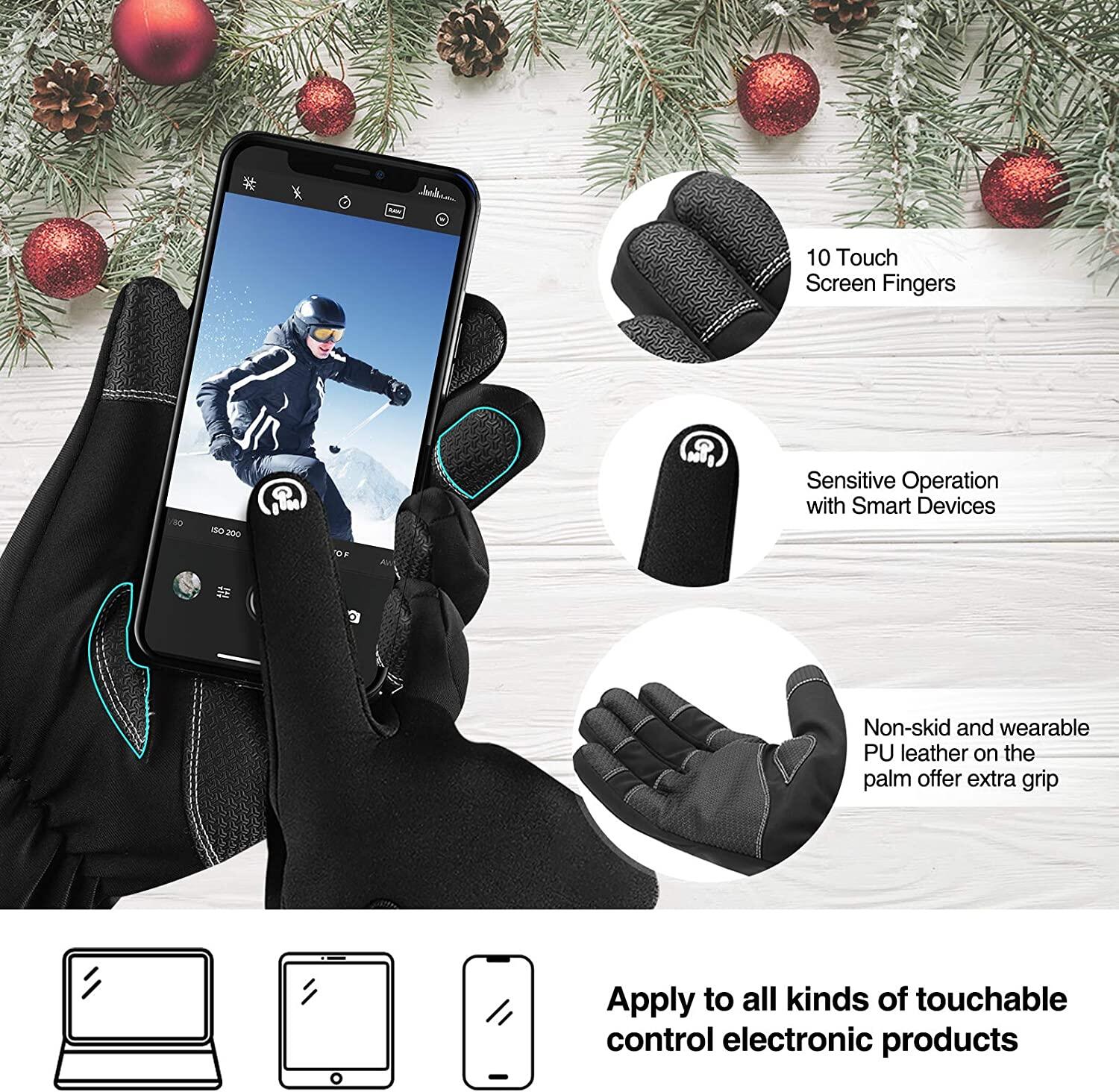• UPGRADED 5 LAYERS EXTRA THICK PROVIDE MORE DEXTERITY - The warm gloves insulated with 5-layer thermal softshells keep hands warm in cold weather but lightweight for good packability. High Quality Polar Fleece lining of mens winter gloves is soft and skin friendly. 3M Thinsulate in the middle layer of snowboard gloves is isolated your hands from cold even in -30℉ weather. The cuffs of mens gloves is stretchy enough to go on and off easily, flexible and suitable for your hands in winter.