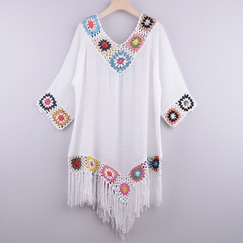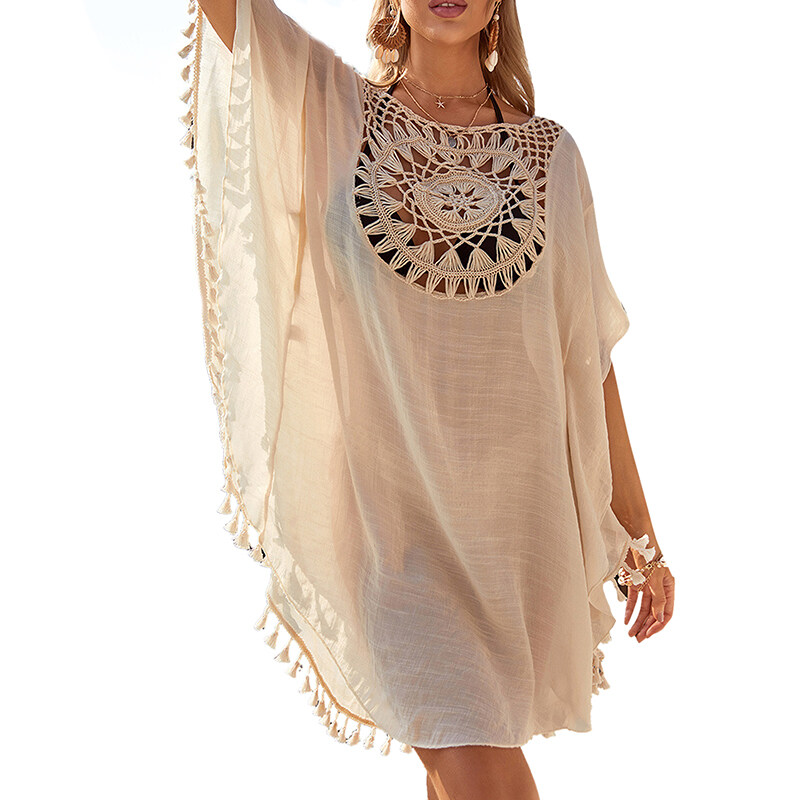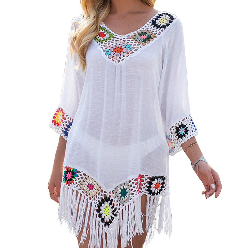 Lovely Beach Cover Up for Women Fashion Sexy Women Hollow Big V-Neck Short Sleeves Irregular Fringe Bikini Beach Outfits