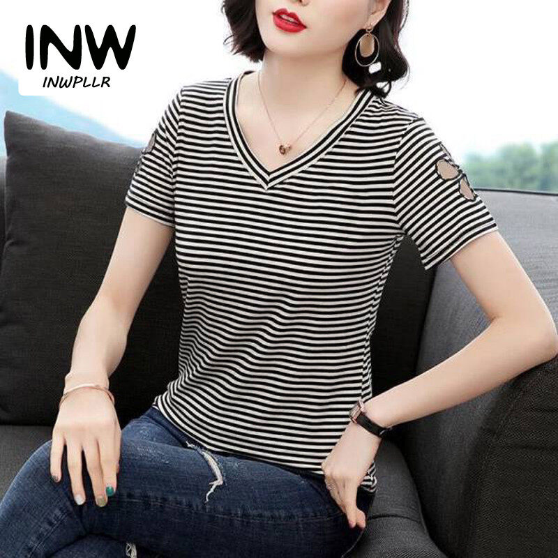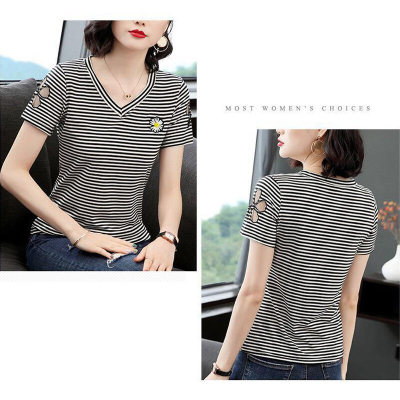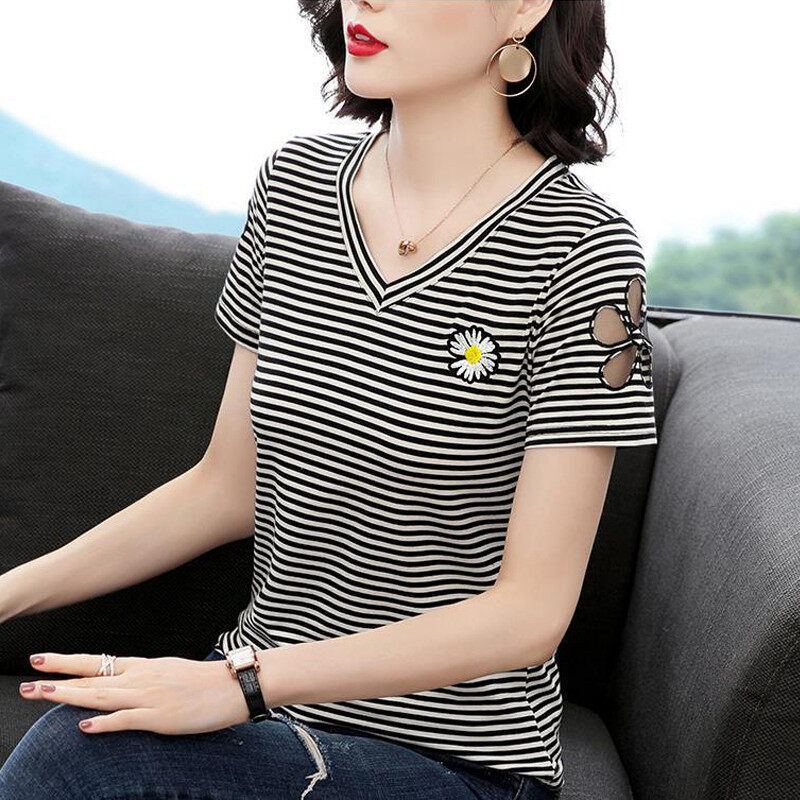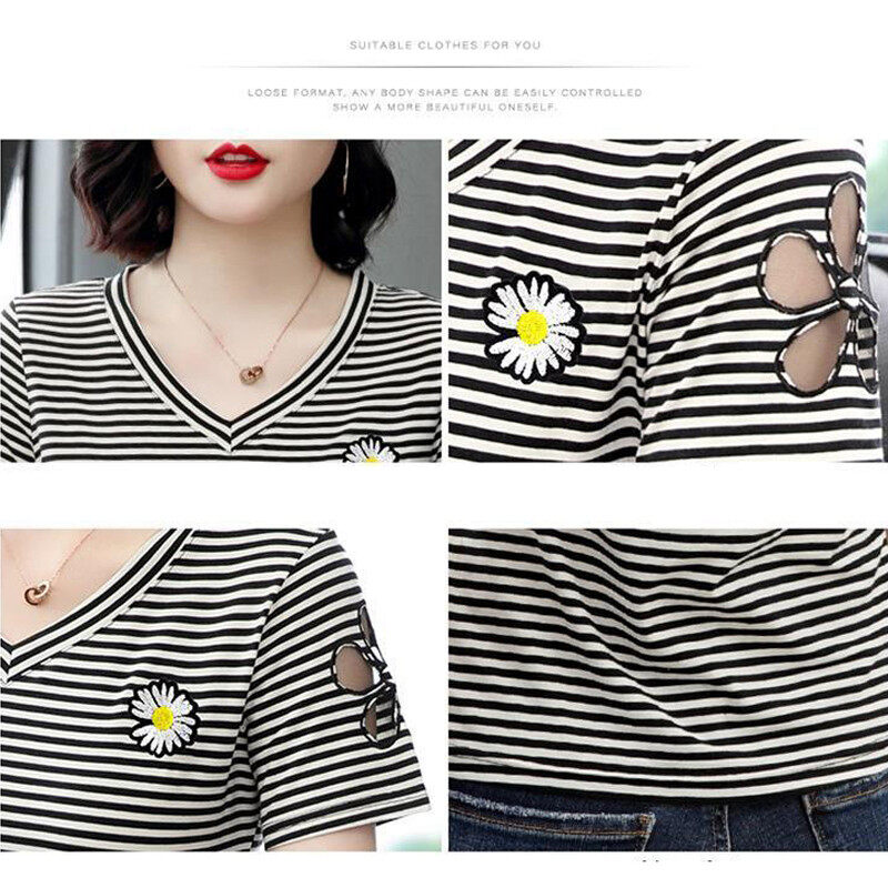 INWPLLR Women Tshirts Daisy Embroidery T-Shirts Fashion V-Neck Stripe Tops Ladies Flower Hollow Short Sleeve Top Tees Large Size