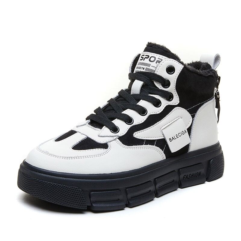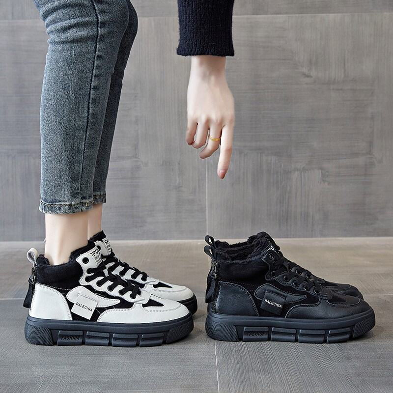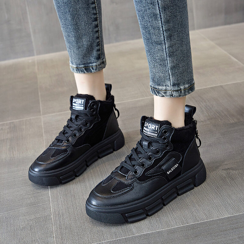High-Top Cotton-padded Shoes Women's Winter Fleece-Lined 2021 New All-Match Genuine Leather Platform Sneakers Elevator Dad Shoes White Shoes