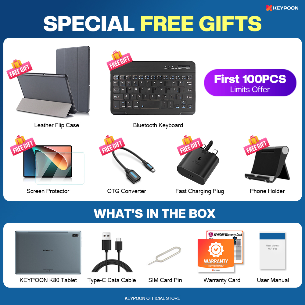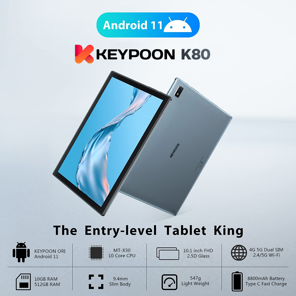 【2022 TOP2】KEYPOON K80 Tablet PC 10.1 Inches Android 11 8800mAh Dual SIM 5G WiFi Gaming Online Classroom Meeting for Students 10GB RAM 128GB 256GB 512GB ROM