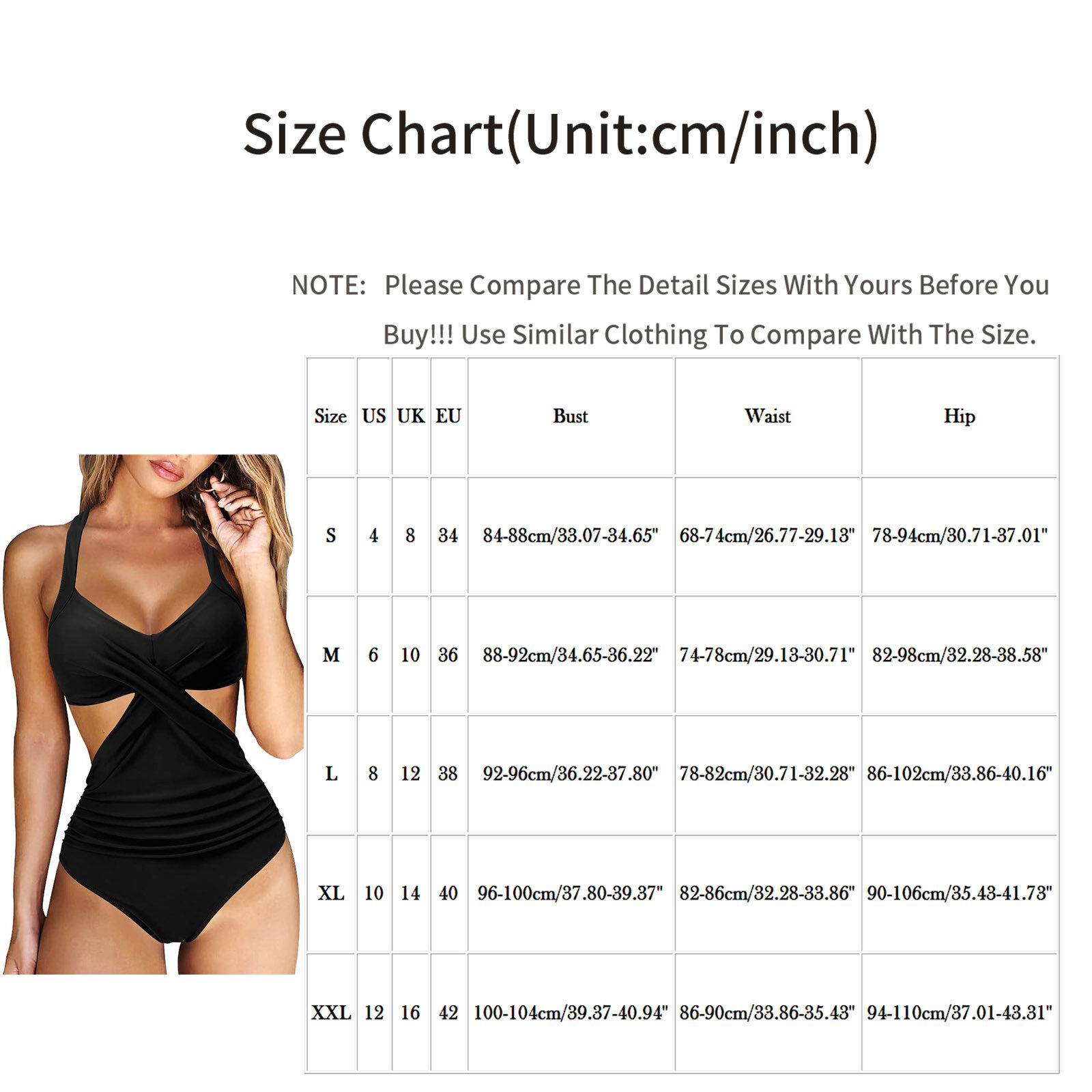 Size:S US:4 UK:8 EU:34 Bust:84-88cm/33.07-34.65'' Waist:68-74cm/26.77-29.13'' Hip:78-94cm/30.71-37.01''