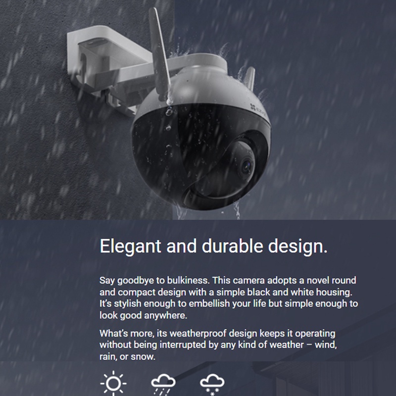 Welcome to EZVIZ Official Store~ We are 100% Singapore in stock, ship within 24 hours of your order! Specifications: ✅Model CS-C8C Lite (1080P) ✅Safty Mark No.:210084-15 ✅Camera -Image Sensor: 1/2.7" Progressive Scan CMOS -Shutter Speed: Self-adaptive shutter -Lens: 4mm @ F1.6, view angle: 87° (Horizontal), 105° (Diagonal) -PT Angle: Pan: 352°, Tilt: 95° -Minimum Illumination: 0.5 Lux @ (F1.6, AGC ON), 0 Lux with IR (data is obtained from EZVIZ laboratories) -Lens Mount: M12 -Day & Night: IR-cut filter with auto switching -DNR: 3D DNR -WDR: Digital WDR -Black & White Night Vision: 30 m / 100 ft. ✅Video & Audio -Max Resolution: 1920 × 1080 -Frame Rate: Max: 30fps; Self-Adaptive during network transmission -Video Compression: H.265 / H.264 -H.265 Type: Main Profile -Video Bit Rate: Ultra-HD; Hi-Def; Standard. Adaptive bit rate. -Audio Bit Rate: Self-Adaptive -Max. Bitrate: 2Mbps ✅Network -Wi-Fi Standard: IEEE802.11b, 802.11g, 802.11n -Frequency Range: 2.4 GHz ~ 2.4835 GHz -Channel Bandwidth: Supports 20MHz -Security: 64/128-bit WEP, WPA/WPA2, WPA-PSK/WPA2-PSK -Transmission Rate: 11b: 11Mbps,11g :54Mbps,11n :72Mbps -Wi-Fi Pairing: AP pairing -Protocol: EZVIZ Cloud Proprietary Protocol -Interface Protocol: EZVIZ Cloud Proprietary Protocol -Wired Network: RJ45 × 1(10M/100M Adaptive Ethernet Port) ✅Storage -Local Storage: Micro SD card slot (Max. 256G) -Cloud Storage: EZVIZ Cloud Storage ✅Function -Smart Alarm: AI-powered human shape detection -Customized Alert Area: Supports -Audio: Supports mic -General Function: Anti-flicker, dual-stream, heart beat, password protection, watermark ✅General -Operating Conditions: -30°C ~ 60°C(-22°F to 140°F ), humidity 95% or less (non-condensing) -IP Grade: Weatherproof Design -Power Supply: DC 12V / 1A -Power Consumption: MAX. 6 W -Dimensions: 158 × 157 × 149 mm (6.22 × 6.18 × 5.87 inch) -Packaging Dimensions: 197 × 185 × 205 mm (7.76 × 7.28 × 8.07 inch) -Net Weight: 510 g (17.99 oz) -Weight (With Package): 885 g (31.22 oz) ✅In the box -Camera (×1) -Power Adapter (×1) -Screw Kit (×1) -Waterproof Kit (×1) -Drill Template (×1) -Regulatory Information (×1) -Quick Start Guide (×1) ✅Certifications -Certifications UL / FCC / CE / WEEE / REACH / ROHS