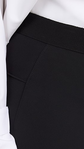 Elastic waistband with button closure, zip fly